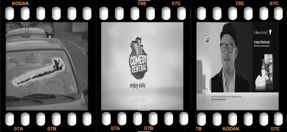Beispiel für eine Sendung in 4:3 Letterbox (linker Frame im Bildseitenverhältnis 4:3 mit großen horizontalen Balken), auf die eine Sendung im Kinoformat folgt (1,85:1 oder 2,35:1 - die rechten beiden Frames im Bildseitenverhältnis 16:9 mit dünneren horizontalen Balken). Die Auflösung des Videostreams betrug 720x576iDie Werberkennung (bzw. Erkennung des Filmendes) erfolgt beim Film links aufgrund der Änderung des Bildseitenverhältnisses, beim Film rechts aufgrund der schwarzen horizontalen Balken (oder wenn vorhanden anhand einer DolbyDigital5.1 Tonspur)
